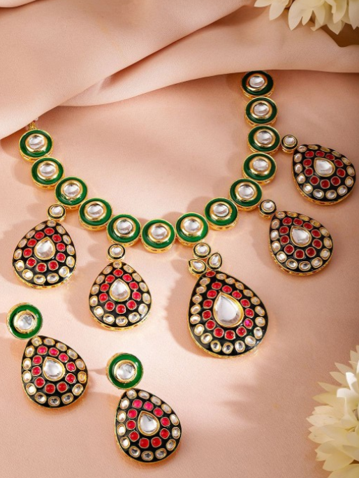 The 24K Gold Plated Kundan Necklace Set exudes timeless elegance and traditional charm. Featuring intricately designed Kundan stones set in luxurious 24K gold plating, this set radiates opulence and beauty. The rich combination of vibrant stones and intricate detailing makes it a perfect accessory for weddings, festivals, or any special occasion. This set includes a stunning necklace, matching earrings, and an exquisite design that complements any attire, adding a regal touch to your look. Ideal for those who appreciate classic beauty with a touch of modern luxury, this Kundan necklace set is a must-have for your jewelry collection.