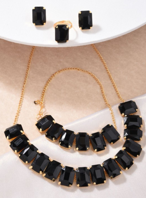 The Classic Black CZ Stone Necklace Set features a sophisticated design with striking black cubic zirconia stones that add an elegant touch to any ensemble. The necklace is carefully crafted to showcase the bold beauty of the black stones, with each piece radiating a timeless charm. Paired with matching earrings, this set is perfect for evening events, parties, or formal occasions, offering a refined and graceful look. Its versatile design ensures it complements both modern and traditional outfits, making it a must-have addition to any jewelry collection.