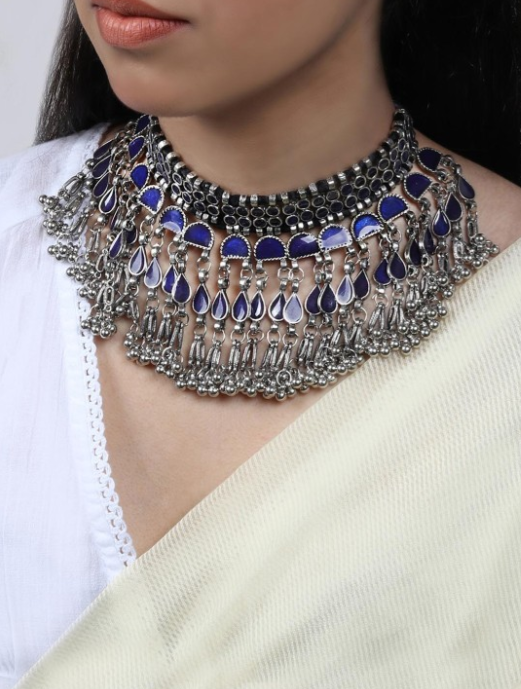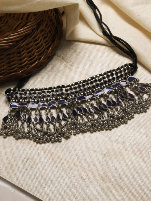 Elegant Silver & Blue Oxidised Choker Necklace