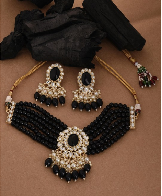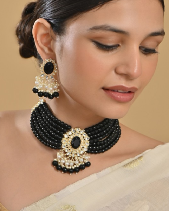 Glamorous Black Beaded Layered Choker Jewelry Set