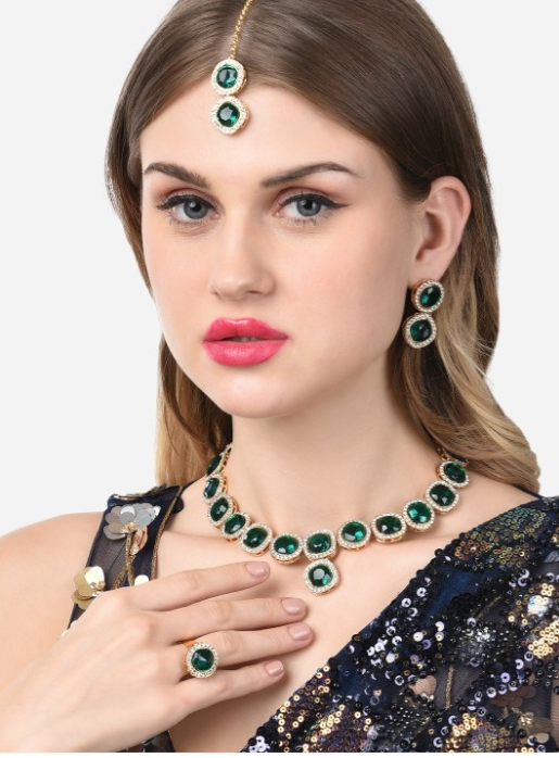 The Gold-Plated Green Stone Jewellery Set is a luxurious and captivating accessory that combines the richness of gold with the vibrant elegance of green stones. The set typically includes a necklace, earrings, and sometimes a bracelet, all featuring intricately crafted gold plating that enhances the natural beauty of the green stones. The deep green hue of the stones, whether they are emerald, jade, or another gemstone, adds a pop of color and sophistication to the piece. Perfect for weddings, parties, or other special occasions, this jewellery set exudes timeless elegance while adding a bold statement to any outfit.