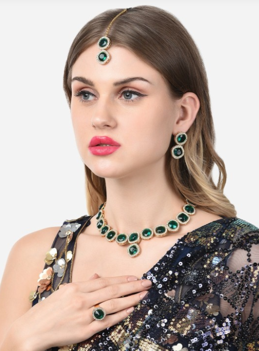 - Bold Statement: The vibrant green stones create a striking contrast with the gold plating.