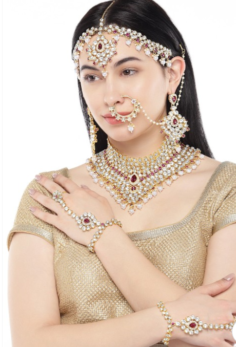 Celebrate your special day with the exquisite Radiant Pink American Diamond Bridal Set, designed to add a touch of luxury and elegance to your bridal look. This stunning set features an intricate combination of 18K gold plating and dazzling pink American diamonds, creating a radiant and sophisticated sparkle. The set includes a beautifully crafted necklace, earrings, and a matching bracelet, all meticulously designed to enhance your natural beauty on your big day. Perfect for brides who want to make a statement, this bridal jewelry set exudes grace and timeless charm.