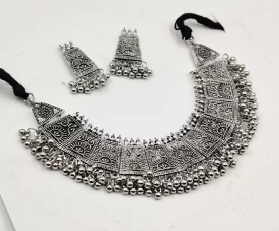 The Timeless Oxidised Silver Elegance Set is a perfect blend of vintage charm and modern sophistication. Crafted with precision, this set features beautifully oxidised silver pieces that exude a refined yet rustic appeal. The intricate design of the necklace and matching earrings makes it an ideal choice for both casual and formal occasions. Its classic, understated elegance effortlessly complements any outfit, making it a staple in your jewelry collection. Whether you’re dressing up for a special event or adding a touch of sophistication to your everyday look, this set is sure to elevate your style with its timeless beauty.